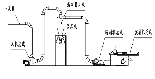 鎂屑機(鎂錠切割機、鎂錠屑割機、鎂錠完屑機、鎂屑斷屑機、鎂屑碎屑機)是完成切削鎂錠的主要設(shè)備;液壓站為鎂屑機壓料、進給提供動力;配電柜及配套電器承擔刀輥旋轉(zhuǎn)、油泵開停、液壓閥換向等各種設(shè)定功能的自動控制工作。斷屑機對鎂屑機切出的鎂屑進行粗粉碎。落料器收集粗粉碎后的鎂屑;風機為鎂屑在系統(tǒng)內(nèi)的運動提供動力。